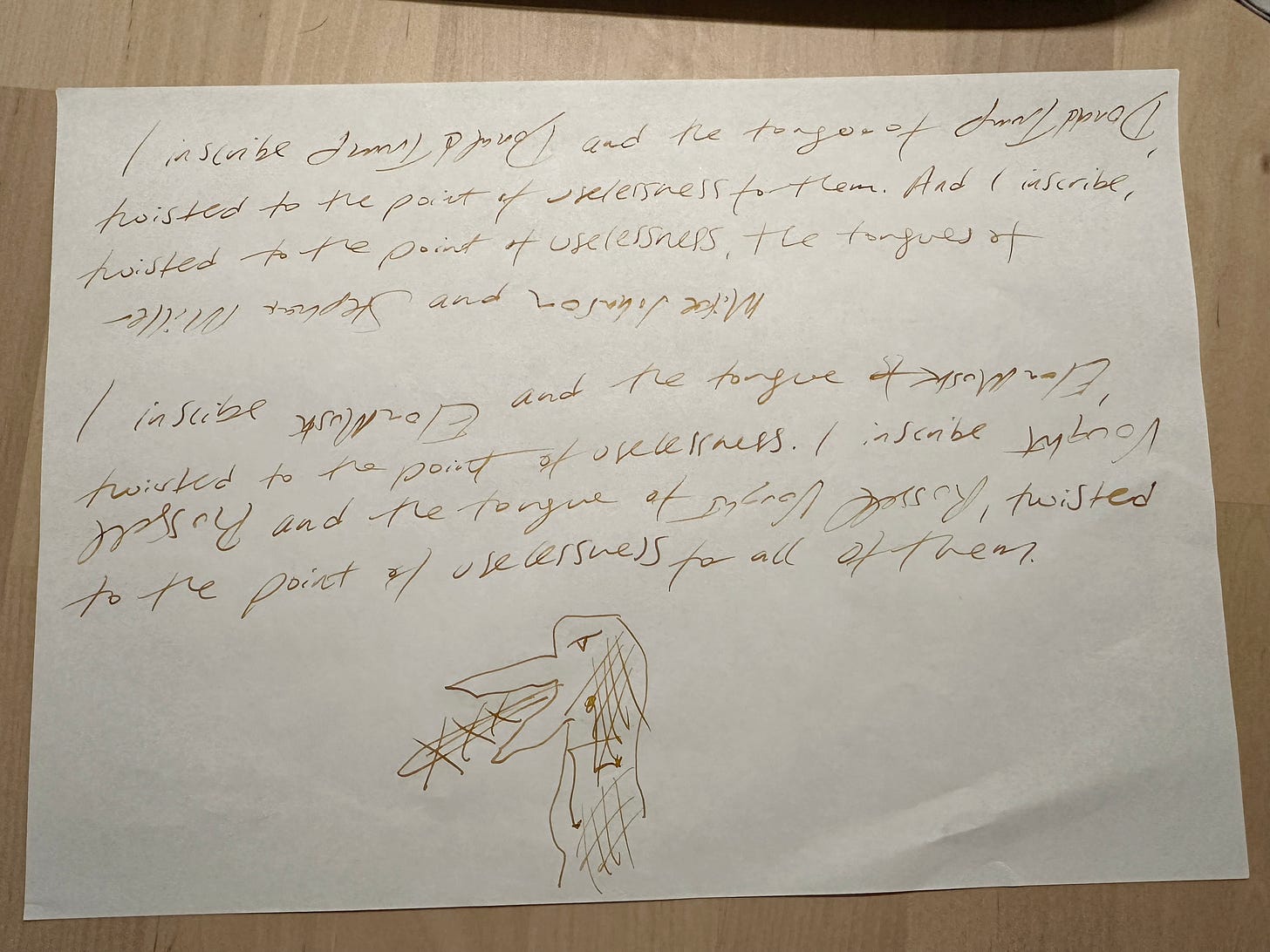 I inscribe [insert Name D] and the tongue of [insert Name D], twisted to the point of uselessness. I inscribe [insert Name E] and the tongue of [insert Name E], twisted to the point of uselessness for all of them.